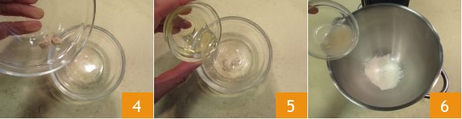 Dissolvez la levure de bière dans l'eau 4, ajoutez le miel 5 et mélangez. Versez la farine manitoba dans le bol d'un batteur et ajoutez la levure dissoute dans l'eau et le miel 6.