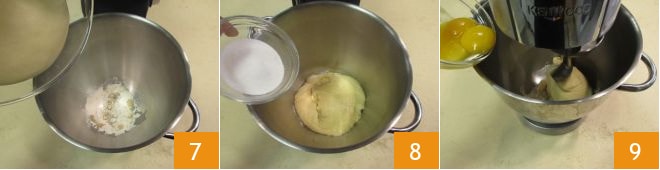 Incorporez à ce stade le premier mélange 7, ajoutez le sucre 8 et commencez à pétrir avec le crochet. Lorsque vous aurez obtenu une pâte lisse et homogène, ajoutez les jaunes d'œufs petit à petit 9. Ajoutez également le sel lorsque la pâte aura complètement absorbé les jaunes.