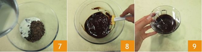 Versez la crème dans le chocolat en deux fois 7, en mélangeant bien avec une spatule jusqu'à ce que le chocolat soit complètement fondu et que vous obteniez un mélange lisse et brillant 8. Couvrez avec du film et laissez reposer au réfrigérateur pendant 2 heures.