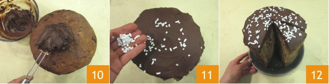 À ce stade, reprenez le panettone désormais froid, décorez-le avec la ganache qui sera maintenant froide et dense 10, parsemez à volonté de sucre en grains 11 et servez-le 12.
