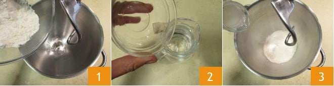 Pour préparer le panettone griottes et chocolat, commencez par le premier mélange. Versez dans le bol d'un batteur équipé d'un crochet la farine manitoba 1. À part, dissolvez la levure de bière dans la quantité d'eau indiquée 2, puis versez dans le batteur 3.