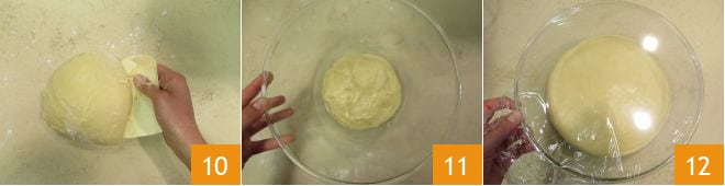 Boulez-la pour obtenir une forme sphérique 10. Transférez dans un bol 11, couvrez avec du film alimentaire. Laissez lever dans le four éteint avec la lumière allumée pendant environ 4-5 heures, en ajoutant au fond une petite casserole d'eau chaude. Alternativement, laissez lever la pâte à température ambiante (26°), à l'abri des courants d'air, jusqu'à ce qu'elle ait doublé de volume 12.