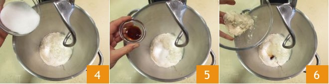 Ajoutez le sucre 4, le malt 5 et la dose de levain indiquée 6.