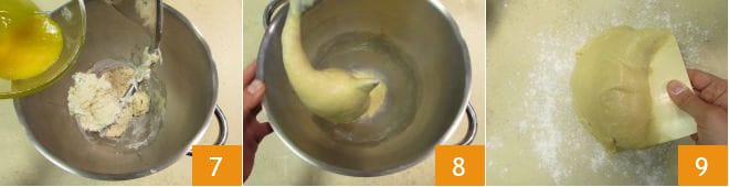 Commencez à pétrir, lorsque vous aurez obtenu un mélange homogène, ajoutez les jaunes d'œufs petit à petit 7, jusqu'à absorption complète. Travaillez avec le crochet à vitesse moyenne-basse jusqu'à obtenir une pâte lisse et élastique 8. À ce stade, avec l'aide d'une spatule, transférez la pâte sur une planche légèrement farinée 9.