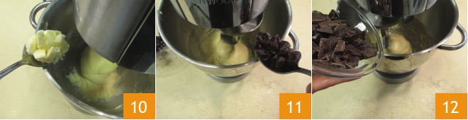 Puis incorporez le beurre en pommade petit à petit 10. Attendez que le premier morceau de beurre soit bien absorbé avant d'ajouter le suivant. Ajoutez dans le bol du batteur les griottes en morceaux 11 et le chocolat noir 12. Travaillez pendant environ 5 minutes, puis arrêtez la machine et attendez 10 minutes.