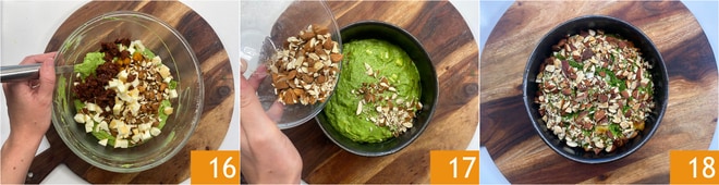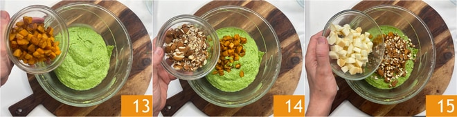 Vous pouvez ensuite verser tous les ingrédients de la garniture : le potiron 13, les amandes grossièrement hachées 14 et la scamorza coupée en dés 15.