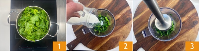 Pour préparer le panettone salé rapide, nettoyez puis faites cuire les cime di rapa pendant environ 8 minutes dans de l'eau bouillante salée à votre goût 1. Il vous faudra environ 500 g de cime, une fois nettoyées et cuites, il vous en faudra 250 g pour la recette. Une fois prêtes, vous pouvez les refroidir immédiatement dans un bol avec de l'eau et des glaçons, de manière à ce que la couleur reste brillante. Égouttez-les et mixez-les avec un mixeur plongeant avec le lait 2 3.