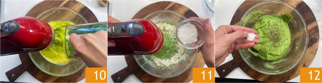 Vous pouvez maintenant ajouter aussi la crème de cime di rapa 10, la farine et la levure tamisées 11, le sel 12 et le poivre.