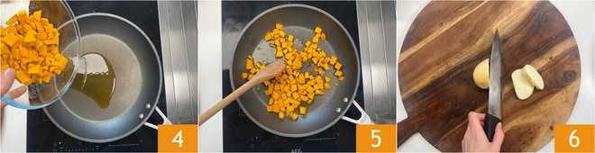 Nettoyez le potiron de sa peau et de ses graines internes, mettez la chair dans une poêle avec un filet d'huile 4, salez à votre goût. Mélangez de temps en temps 5 et faites cuire à feu moyen pendant environ 10 minutes, les cubes doivent s'attendrir mais rester fermes. Sur une planche à découper, vous pouvez couper la scamorza fumée en dés 6.