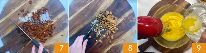 Hachez grossièrement aussi les tomates séchées 7 et les amandes 8. Maintenant que tout est prêt, vous pouvez vous occuper de la pâte. Tout d'abord, faites fondre le beurre à feu doux et laissez-le tiédir. Ensuite, commencez à fouetter les œufs avec un batteur électrique, ajoutez le beurre fondu tiédi en filet 9 tout en continuant à travailler avec le batteur.