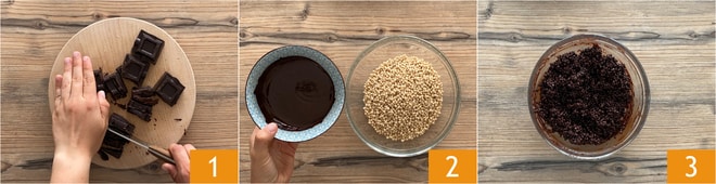 Pour réaliser les paniers à la crème au café, commencez par hacher le chocolat avec un couteau 1. Faites fondre le chocolat au micro-ondes, à 300 W pendant 30 secondes, par intermittence. Vous pouvez aussi le faire fondre au bain-marie sur la plaque de cuisson. Dans un bol, versez les crispies de soja et ajoutez le chocolat noir fondu 2. Mélangez avec une spatule pour amalgamer les deux ingrédients 3.