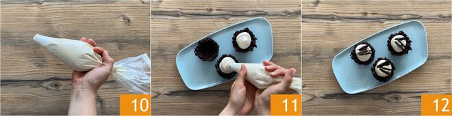 Versez la crème dans une poche à douille avec une douille lisse de 1,5 cm de diamètre 10. Retirez les paniers des moules et déposez-les sur le plateau de service. Remplissez les paniers avec la crème au café 11 et décorez avec des copeaux de chocolat noir 12. Les paniers à la crème au café peuvent être dégustés immédiatement ou placés au réfrigérateur jusqu'au moment de les servir.
