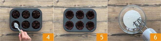 Versez le mélange dans un moule à muffins de 6 cm de diamètre et 4 cm de hauteur. Avec le dos d'une cuillère à café, donnez-lui la forme d'un panier en faisant un trou au centre et en étalant la pâte sur les bords du moule 4. Vous aurez ainsi créé les paniers 5. Placez-les au réfrigérateur pendant 30 minutes ou jusqu'à ce que le chocolat durcisse. Préparez la crème au café : montez la crème avec un fouet électrique 6.