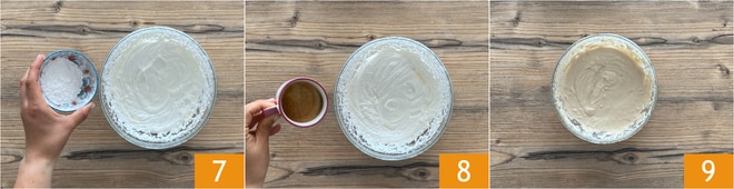 Ajoutez le sucre glace 7 et continuez à battre. Incorporez le café froid non sucré 8 et mélangez délicatement pour ne pas faire retomber le mélange 9.