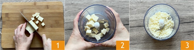 Pour préparer les petits paniers au jambon, coupez l'Asiago en morceaux 1, mettez-le dans le mixeur 2 et mixez-le 3.