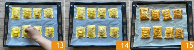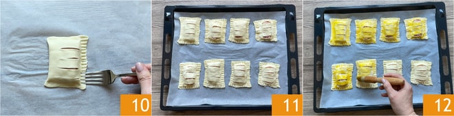 Avec les dents de la fourchette, appuyez sur les bords pour créer un motif décoratif et les sceller 10. Transférez les petits paniers sur une plaque recouverte de papier sulfurisé 11, badigeonnez la surface avec le jaune d'œuf 12.