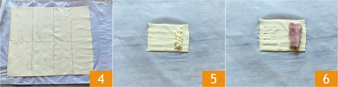 Divisez le rouleau de pâte feuilletée en 8 rectangles égaux 4. Prenez un rectangle et farcissez le côté le plus court avec le fromage 5 et le jambon 6.