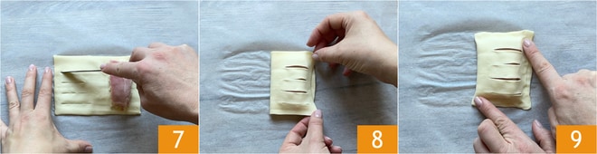 Pratiquez des incisions sur le côté sans garniture 7. Repliez en deux 8 et scellez les bords 9.