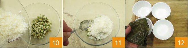Lorsque les pieds auront tiédi, ajoutez 50 g de Grana Padano DOP râpé 10 et mélangez pour amalgamer le tout 11. Prenez maintenant 4 cocottes de 9 cm de diamètre et tapissez la base et les côtés avec 2 feuilles de vigne chacune, formant une sorte de panier 12.