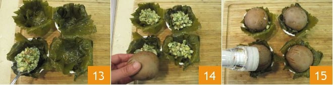 Versez au centre une cuillerée du mélange de pieds 13 et recouvrez avec le chapeau d’un cèpe 14, puis assaisonnez avec du sel 15, du poivre et un filet d'huile.