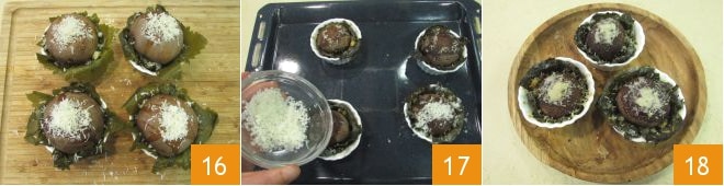 Saupoudrez la surface avec 10 g du Grana Padano DOP restant 17, puis transférez les cocottes sur une plaque de cuisson et faites cuire dans un four statique préchauffé à 180° pendant 15 minutes. Une fois ce temps écoulé, saupoudrez avec le reste de Grana Padano DOP râpé 18 et poursuivez la cuisson pendant encore 3 minutes en allumant le gril à 240°. Vos paniers de feuilles de vigne avec cèpes et Grana Padano sont prêts à être servis 18 !