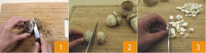 Pour préparer les paniers de feuilles de vigne avec cèpes et Grana Padano, commencez par nettoyer les champignons : grattez-les délicatement avec un couteau à lame lisse pour éliminer tout résidu de terre 1, puis séparez le chapeau du pied 2 et coupez ce dernier en dés 3.
