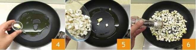 Dans une poêle, chauffez l'huile avec une gousse d'ail 4, puis ajoutez les pieds des champignons 5, salez et poivrez 6.