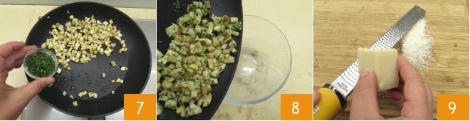 Faites cuire à feu doux pendant environ 5 minutes, puis éteignez le feu et ajoutez le persil haché, mélangez bien, versez dans un bol 8 et laissez tiédir. Pendant ce temps, râpez le Grana Padano DOP 9.