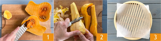 Pour réaliser la panna cotta à la citrouille, commencez par nettoyer la citrouille en retirant les graines et les filaments internes 1, puis enlevez la peau 2 et coupez la pulpe en dés; il vous en faudra 200 g. Tapissez un cuiseur vapeur en bambou avec du papier sulfurisé 3; si vous possédez un autre type de cuiseur vapeur, il n'est pas nécessaire d'utiliser du papier sulfurisé.