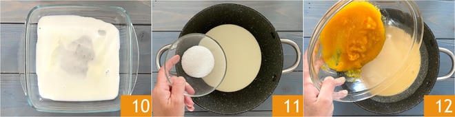 Faites tremper les feuilles de gélatine dans le lait pendant au moins 10 minutes 10. Pendant ce temps, versez la crème et le sucre dans une casserole 11, ajoutez la purée de citrouille 12 et mélangez avec un fouet à main.