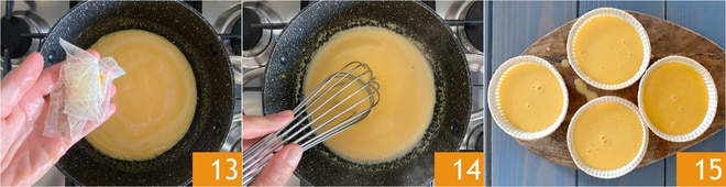 Mettez la casserole sur le feu et faites cuire à feu doux pendant 10 minutes, puis ajoutez les feuilles de gélatine bien essorées 13. Mélangez rapidement pour dissoudre la gélatine uniformément 14 et éteignez le feu. Versez le mélange obtenu dans 4 moules individuels d'un diamètre de 8 cm, jetables ou en silicone, et laissez refroidir 15, puis mettez au réfrigérateur pour raffermir pendant au moins 2 heures.