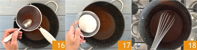 Préparez le nappage au cacao : tamisez le cacao dans une casserole où vous aurez versé l'eau 16, ajoutez le sucre 17 et faites cuire à feu doux pendant 10 minutes, en remuant avec un fouet à main 18.