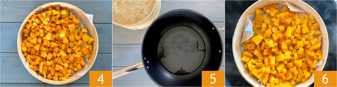Transférez les cubes de citrouille dans le cuiseur vapeur 4 et couvrez avec le couvercle. Versez 2 doigts d'eau dans un wok ou une poêle 5, placez le cuiseur vapeur dessus et faites cuire la citrouille pendant 10 minutes 6.