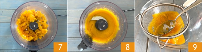 Une fois cuite, transférez la citrouille dans un mixeur 7 et mixez pour la réduire en purée 8, puis passez-la au tamis 9.
