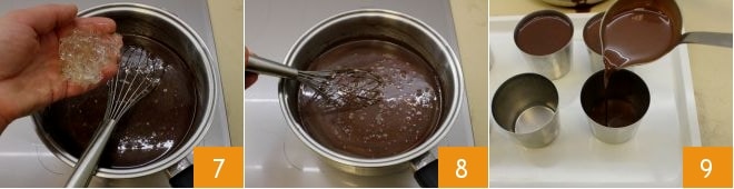 Pressez bien les feuilles de gélatine et ajoutez-les au mélange 7, puis mélangez avec un fouet jusqu'à ce qu'elles soient complètement dissoutes 8. Éteignez le feu et versez le mélange en le répartissant dans 5 moules 9 et laissez-les raffermir au réfrigérateur pendant au moins 4 heures.
