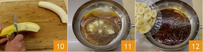 En attendant, préparez les bananes caramélisées : épluchez-les 10, puis dans une poêle ou une casserole à fond épais, faites fondre à feu très doux le beurre avec le sucre 11, mélangez avec une spatule en bois quand ils seront fondus et faites cuire à feu très doux jusqu'à ce que le caramel ait atteint une belle couleur ambrée. À ce moment-là, ajoutez la banane coupée en rondelles d'environ un demi-centimètre 12.