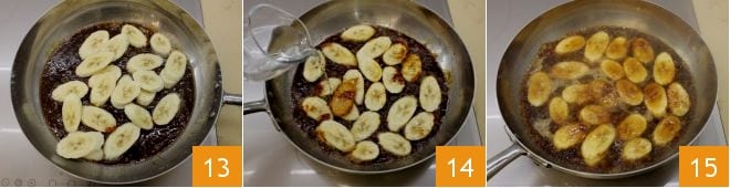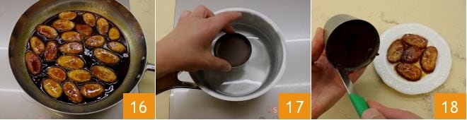 Éteignez le feu 16 et répartissez les bananes caramélisées sur les assiettes de service. Ensuite, sortez la panna cotta du réfrigérateur et pour les démouler plus facilement, plongez les moules pendant quelques fractions de seconde dans une casserole d'eau chaude 17. Puis aidez-vous d'un petit couteau pour détacher plus facilement les bords 18