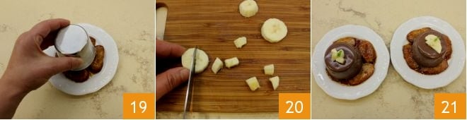 et retournez les moules pour démouler la panna cotta au chocolat sur le lit de bananes 19. Coupez en tranches ou en dés la petite banane pour la décoration 20 et garnissez la panna cotta au chocolat avec des bananes caramélisées avant de servir 21 !