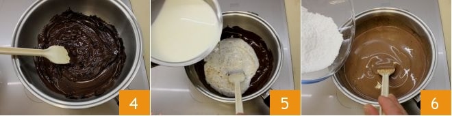 Faites fondre le chocolat au bain-marie, en le plaçant dans un bol ou en mettant une petite casserole dans une autre casserole remplie d'eau, juste assez pour que l'eau ne touche pas le récipient où vous avez mis le chocolat. Remuez pour le faire fondre complètement 4, puis ajoutez la crème chauffée séparément 5 et le sucre glace tamisé 6. Continuez à remuer avec une spatule et chauffez le tout à feu doux sans jamais porter à ébullition et en continuant à mélanger pour éviter que le chocolat ne fasse des grumeaux.