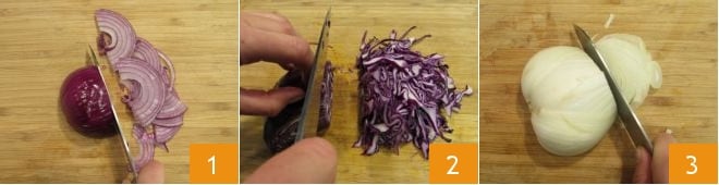 Pour réaliser la panzanella d'hiver, commencez par éplucher et trancher finement l'oignon rouge 1. Coupez également le chou rouge en fines lanières après avoir retiré les feuilles extérieures et le trognon central 2, puis procédez de la même manière avec les fenouils 3.