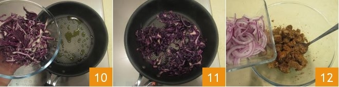 Réservez la courge et dans la même poêle, chauffez à nouveau un filet d'huile, cette fois ajoutez le chou rouge 10 et faites-le sauter pendant 5 minutes 11. À ce stade, reprenez le pain imbibé et ajoutez tous les ingrédients préparés : l'oignon 12,