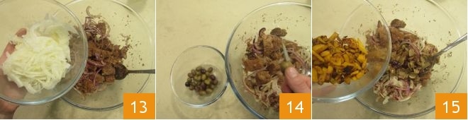 le fenouil 13, les olives, en veillant à les dénoyauter avec un petit couteau 14, enfin ajoutez également la courge 15 et le chou sautés à la poêle.