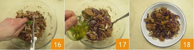 Parfumez avec des brins de ciboulette coupés en petits morceaux 16, assaisonnez avec de l'huile 17, du sel et du poivre à volonté. Votre panzanella d'hiver est prête à être dégustée 18 !
