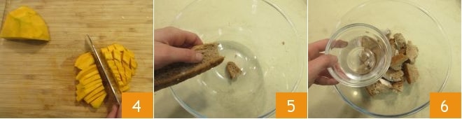 Épluchez la courge et coupez-la en petits cubes (vous devez en obtenir environ 150 g) 4. Émiettez les tranches de pain à la main dans un grand bol 5. Humidifiez avec de l'eau 6
