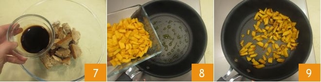 et du vinaigre balsamique 7. Mélangez, couvrez de film plastique et laissez imprégner. Pendant ce temps, poursuivez la préparation : chauffez un filet d'huile dans une poêle et ajoutez la courge 8. Faites sauter la courge à feu vif pendant environ 3 minutes, elle doit être bien dorée 9.