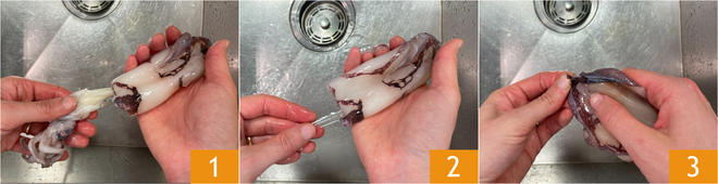 Pour préparer la panzanella de mer, consacrez-vous d'abord au Comment nettoyer les calamars : détachez délicatement la tête de la poche 1, puis retirez la plume de cartilage qui se trouve à l'intérieur 2. Rincez sous l'eau courante et aidez-vous avec les mains pour éliminer les entrailles qui se trouvent dans la poche. Incisez avec un petit couteau la partie finale de la poche et retirez la peau extérieure 3. Coupez ensuite les poches en anneaux d'environ 2 cm de largeur. Reprenez la tête et faites une incision juste en dessous des yeux, puis réservez les tentacules avec la poche découpée.