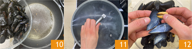 Mettez les moules dans la même poêle où vous avez cuit les crevettes et les calamars 10, puis couvrez avec le couvercle 11 et faites cuire à feu moyen. Après une minute, elles commenceront à s'ouvrir, alors retirez-les au fur et à mesure de la poêle. Filtrez le fond de cuisson et séparez la chair de la coquille 12. Réservez.