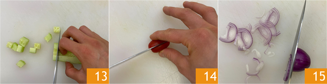 Maintenant, occupez-vous des légumes : pelez les concombres et coupez-les en dés d'environ 2 cm 13. Coupez les tomates cerises en deux 14 et émincez finement l'oignon 15.