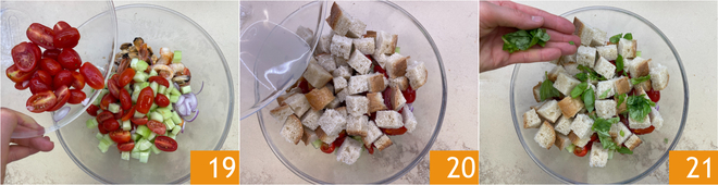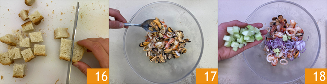 Enfin, coupez le pain en cubes d'environ 3 cm 16. Vous êtes prêts à assembler le plat : dans le bol avec les crevettes et les calamars, ajoutez les moules 17, l'oignon et les concombres 18.