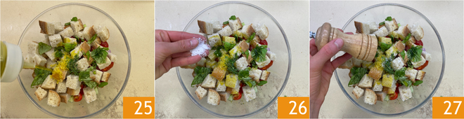 Complétez avec un filet d'huile 25 et ajustez le sel 26 et le poivre 27.